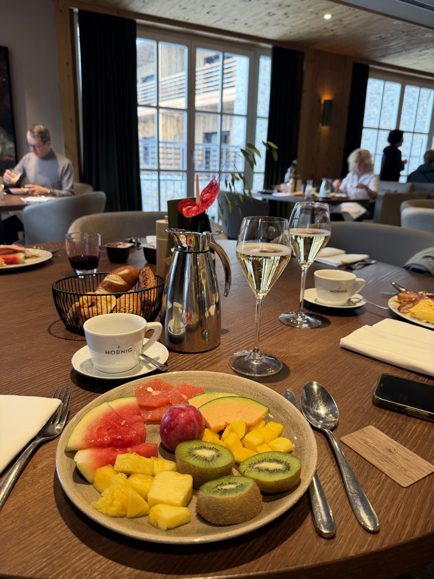 The breakfast buffet was particularly impressive with a wide selection of fresh breads, cheeses, eggs, fruit, pastries, and hot dishes – perfect before a day on the mountain.